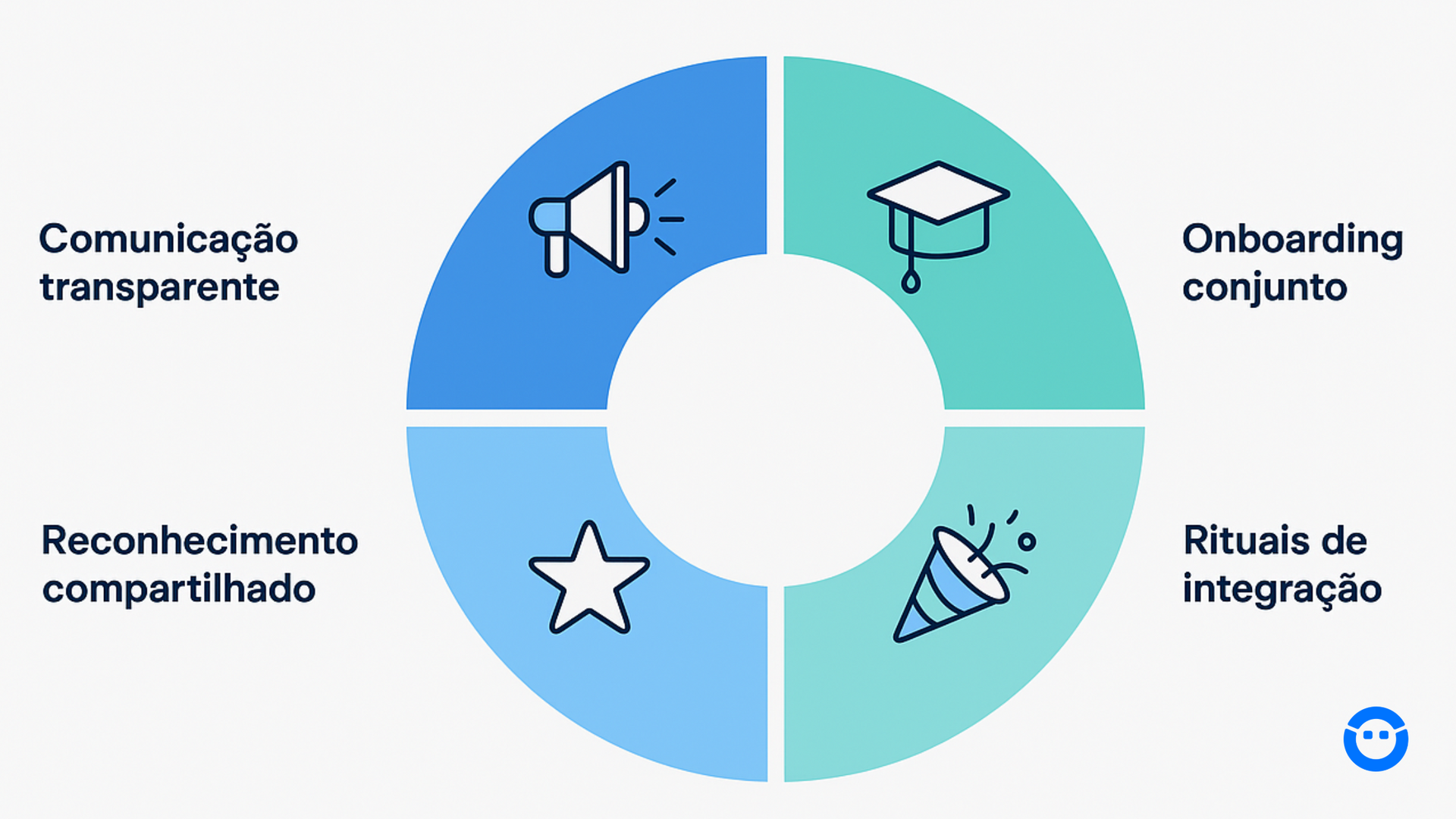 Dica rápida: Realizar pesquisas de clima conjuntas entre times internos e externos é uma excelente forma de identificar lacunas culturais e propor ações práticas.